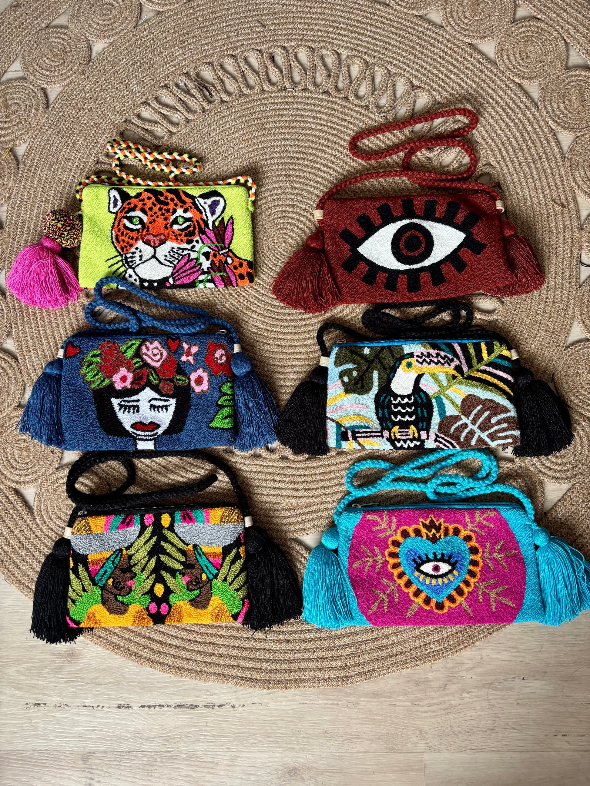 Add a touch of mysticism and protection to your outfit with our Handmade Evil Eye crossbody, beautifully upholstery by skilled Wayuu artisans. This handcrafted piece blends ancestral symbolism with contemporary fashion, creating a bold and meaningful accessory.