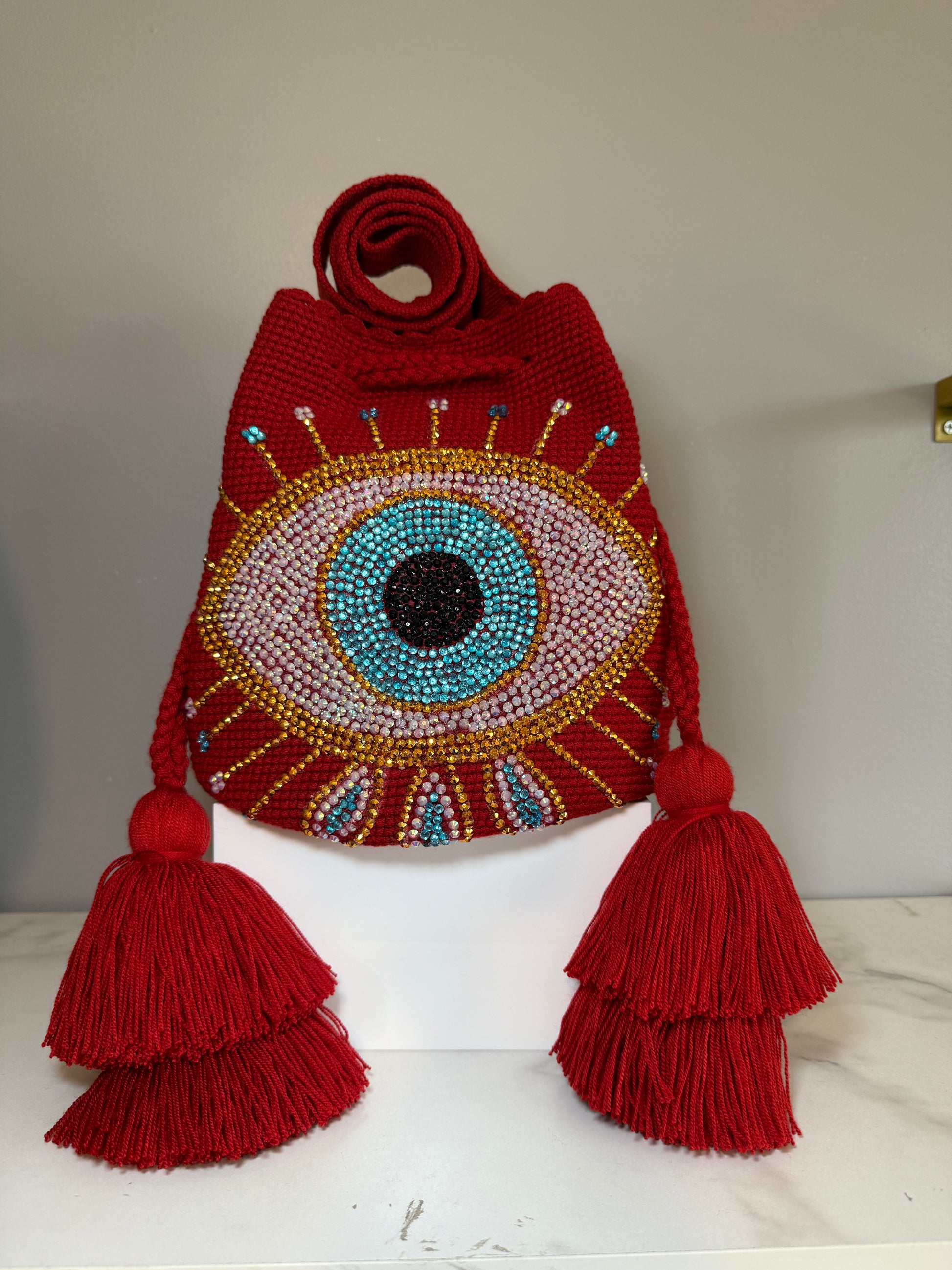 Hand-decorated bag with an eye. Medium size stockings 9x9 in