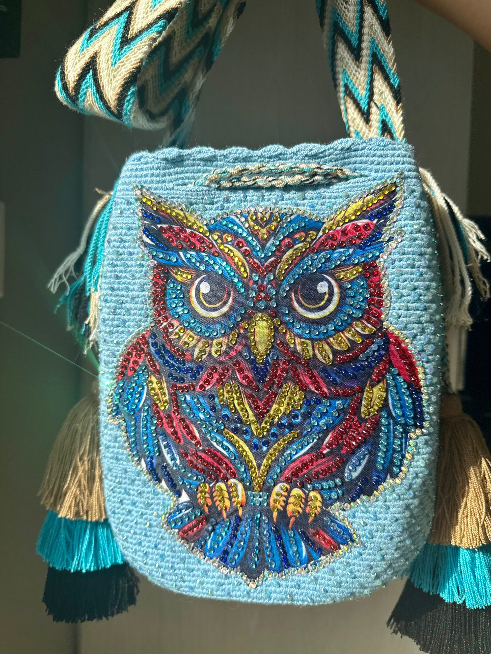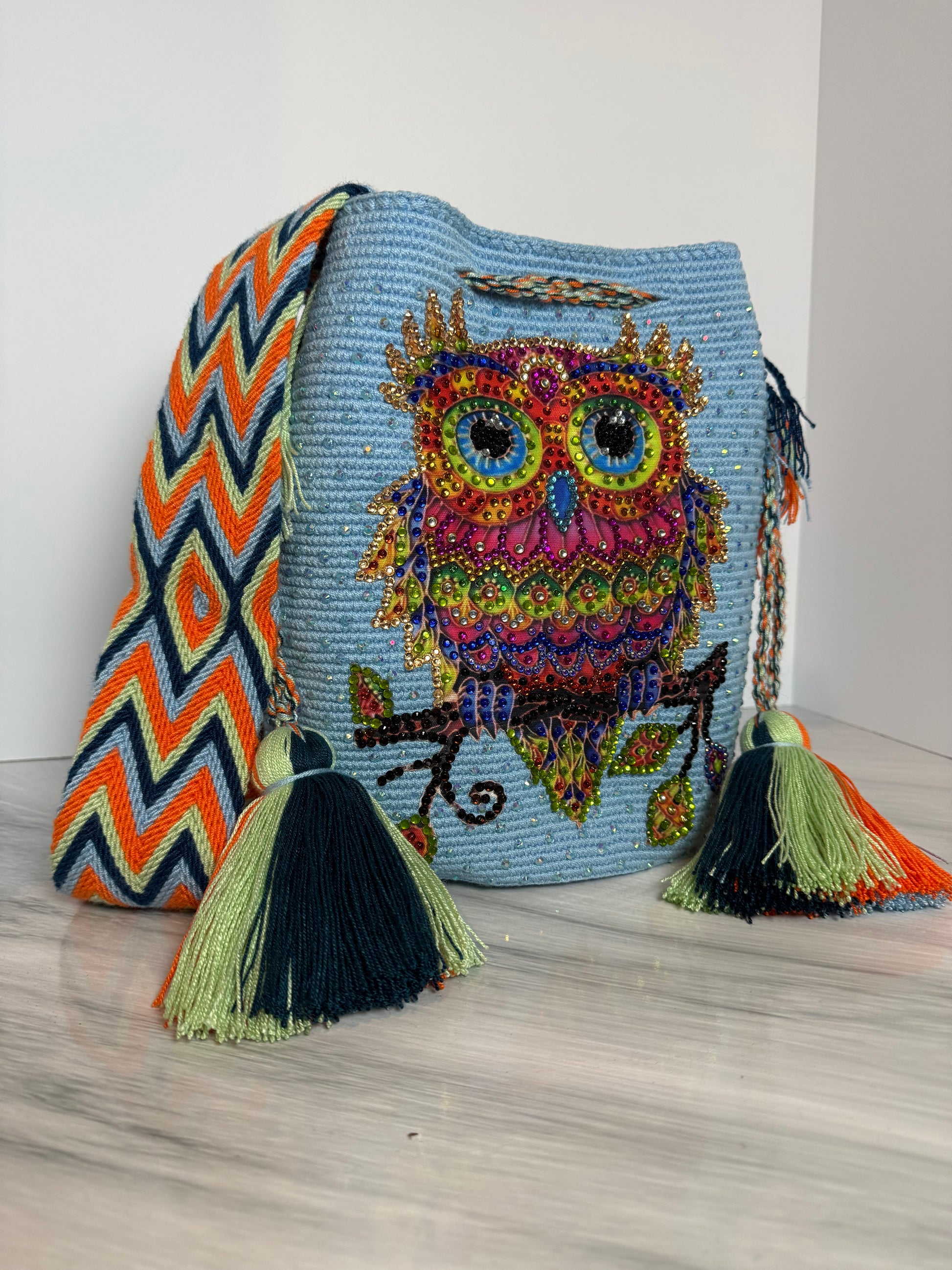 Wayuu Bag L Owl Decorated Blue Unique Handmade Artisan Bag