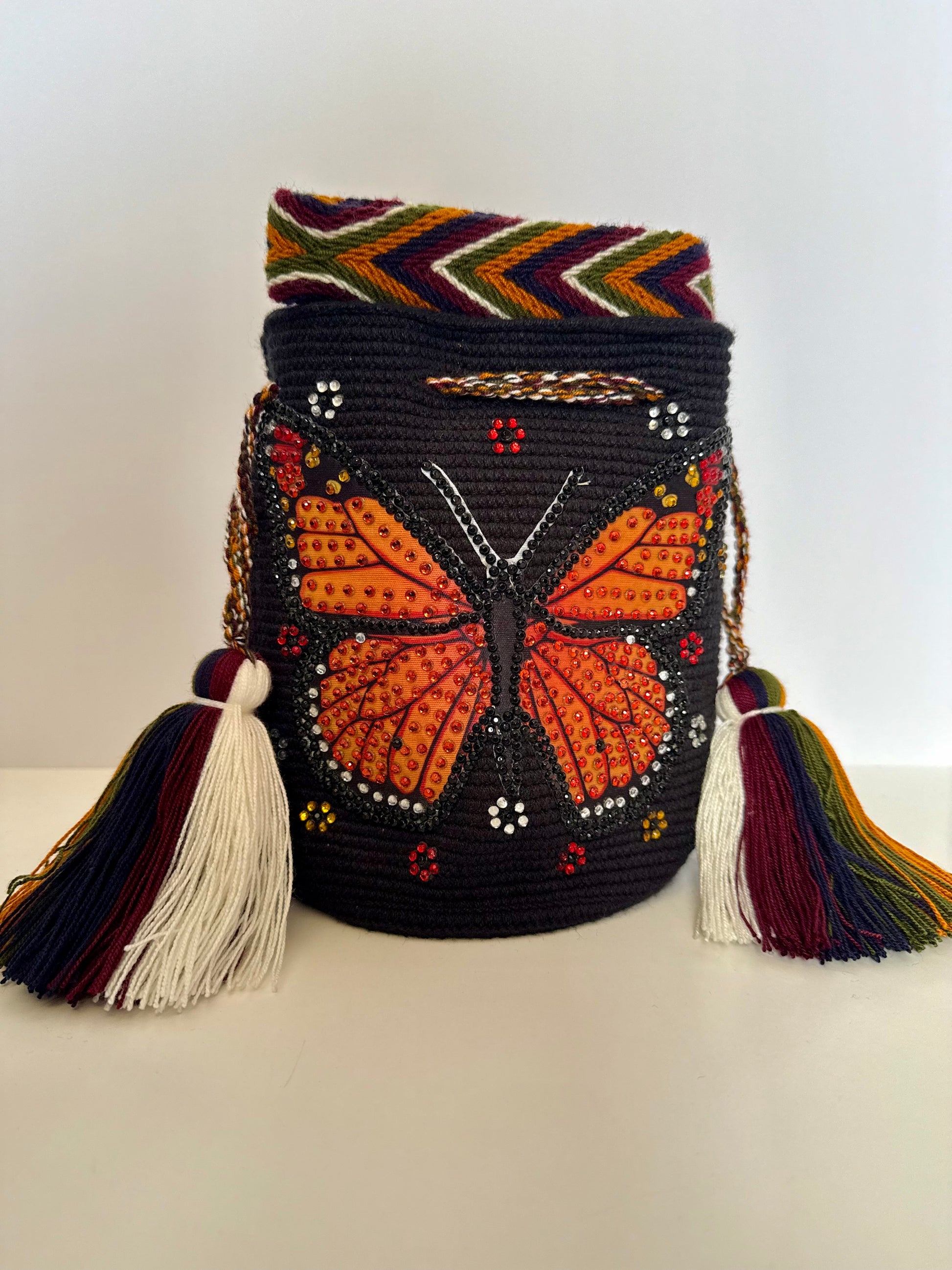 Embrace the beauty of this Wayuu Bag m with decorated butterfly, handcrafted by Wayuu artisans and embellished with sparkling stones and vibrant tassels. The butterfly symbolizes transformation, freedom, and new beginnings, making this bag a piece filled with positive energy and style.